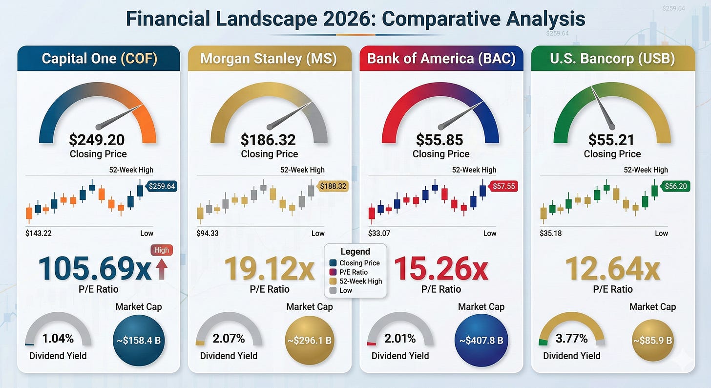 The market is telling us two things here. First, it trusts Morgan Stanley’s fees twice as much as it trusts U.S. Bancorp’s loans. Second, nobody knows how to price Capital One, so they are pricing it on hope and accounting noise.