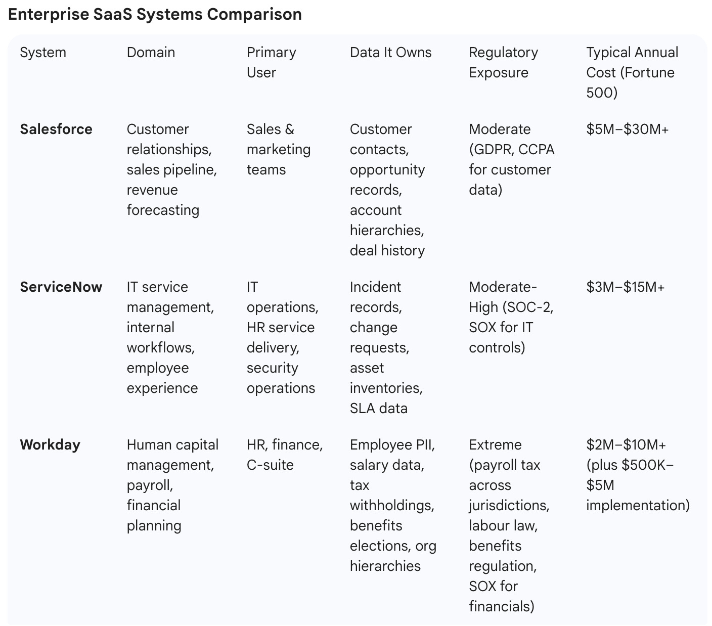 Most enterprise technology commentary treats “SaaS” as a single category. It is not. Inside a large organisation, Salesforce, ServiceNow, and Workday occupy fundamentally different positions, serve different masters, and carry different levels of legal exposure.