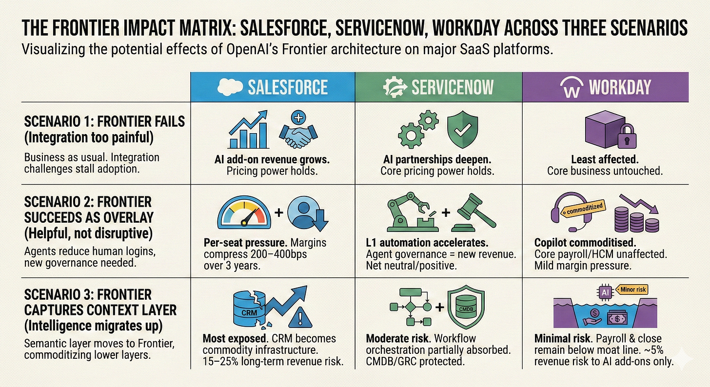 The bear case isn’t that Frontier replaces the incumbents. It’s that Frontier commoditises their AI premium, forcing them to compete on core platform value rather than charging extra for AI features. That’s a margin compression story, not an existential one. It looks like this: