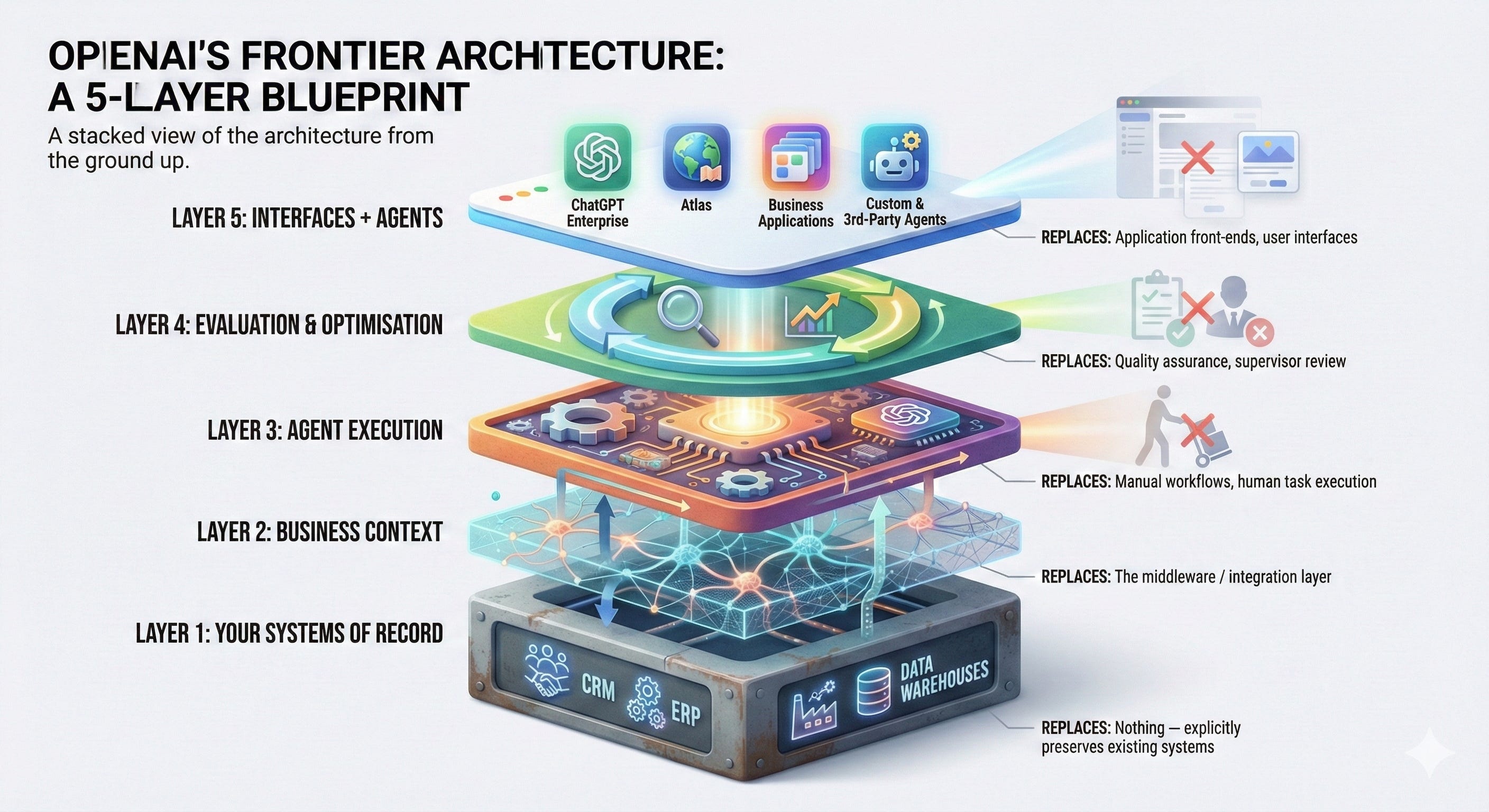 OpenAI is not proposing to replace Salesforce, ServiceNow, or Workday. Not explicitly. The pitch is more subtle. Frontier positions itself as the intelligence layer that sits on top of everything - it reads from your CRM, your ticketing system, your HR platform, builds a unified understanding of how information flows, and then deploys AI agents that act across all of those systems simultaneously.