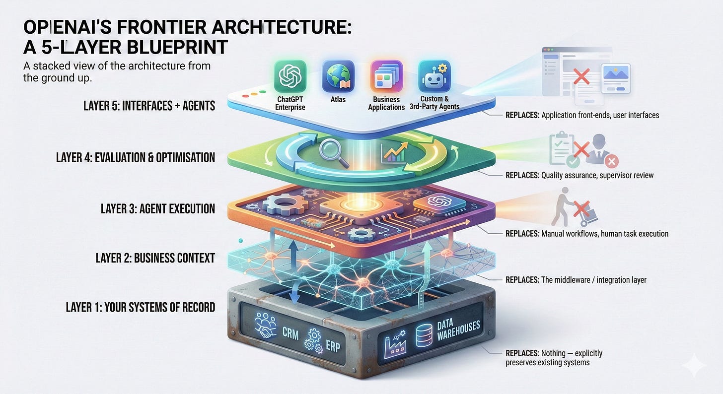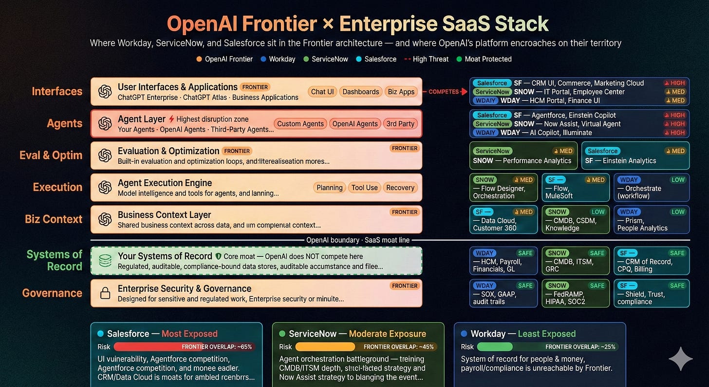 We stand by that argument, and this week we’ll focus on Open AI’s Frontier over Anthropic’s Claude Code and CoWork. Frontier isn’t proposing to replace code with code. It’s proposing something more subtle and, if it works, more consequential. It wants to sit on top of the enterprise stack and absorb the parts that matter most - the user relationship, the decision-making layer, the cross-system intelligence - while leaving the boring, regulated, legally liable parts exactly where they are.