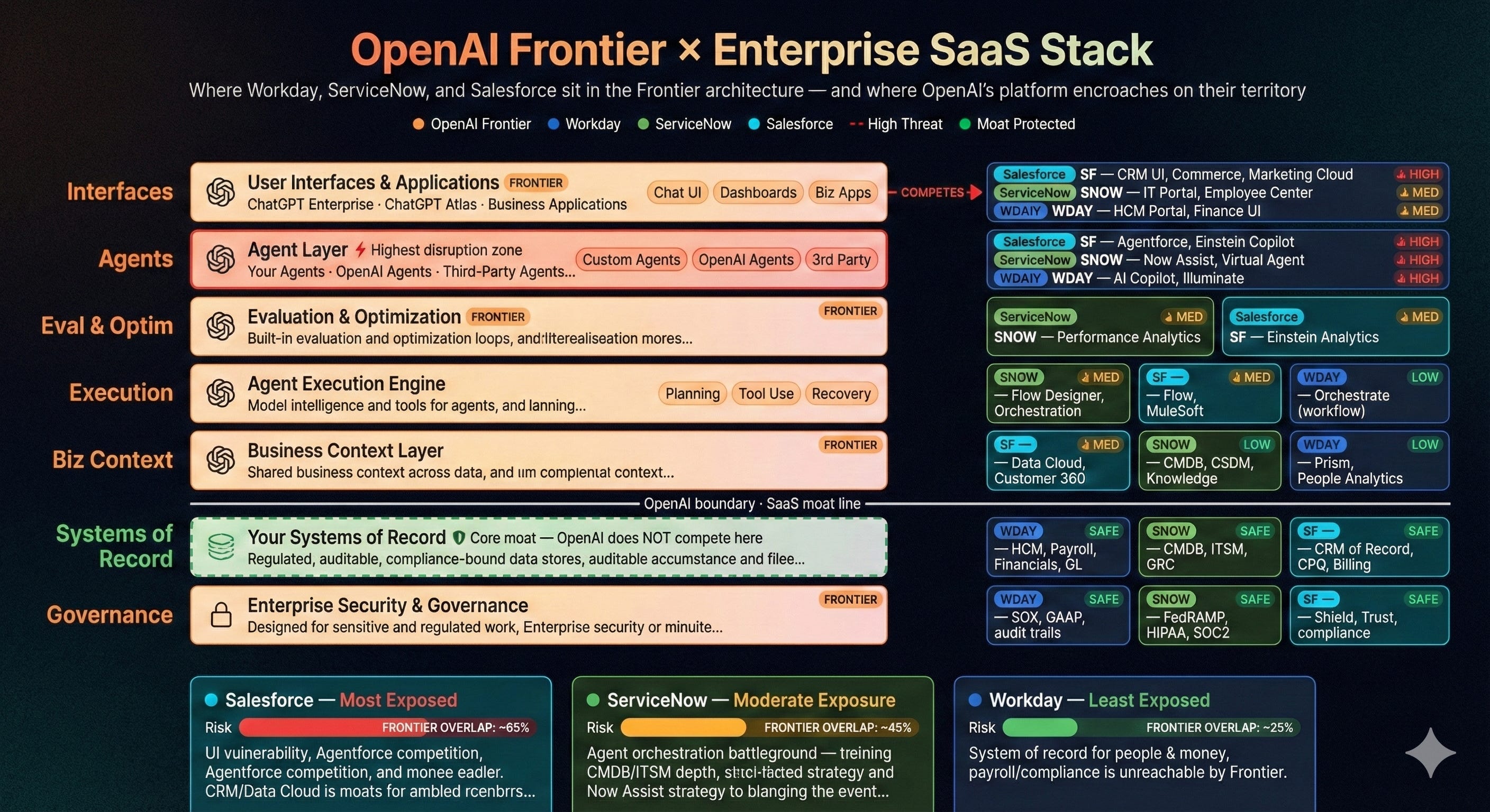 Workday’s copilot features face some competitive pressure from the Frontier interface layer. But the core business, system of record for people and money, sits entirely below the moat line.